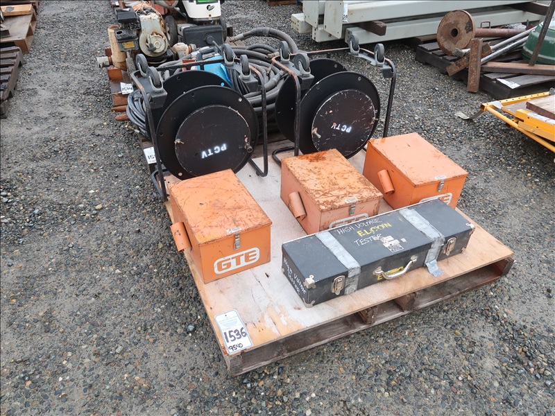 LOT, ASSORTED ELECTRICIANS TOOLS & (2) HOSE REELS ON CART W/CASTERS ON THIS PALLET