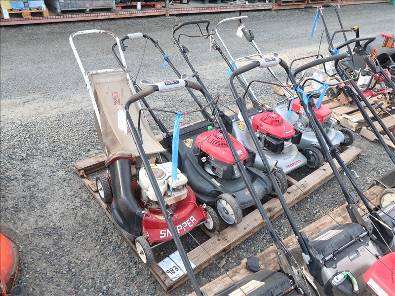 LOT, (3) HONDA & (1) SNAPPER WALK BEHIND GAS ROTARY LAWN MOWERS ON THIS PALLET (HONDA MOWERS HAVE NO BAGS, NEEDS REPAIR)