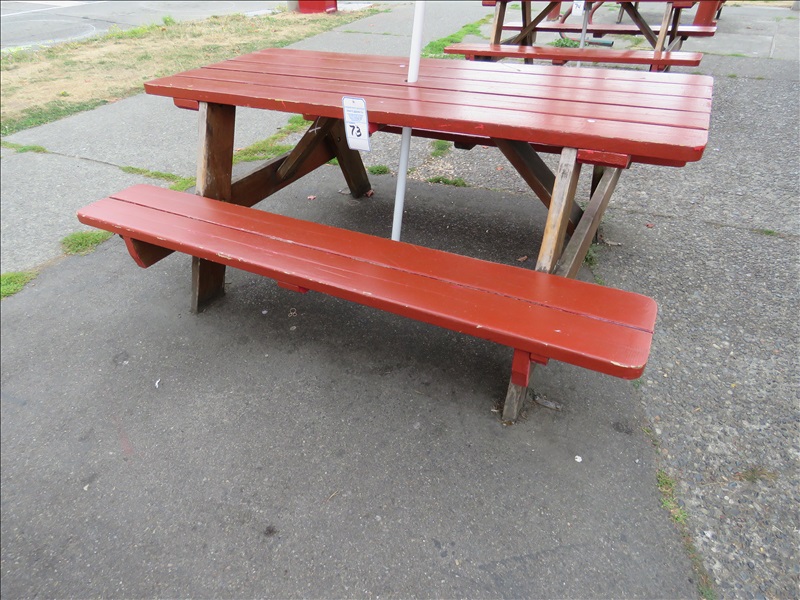 WOOD PICNIC TABLE (TABLE IS ANCHORED TO GROUND, $100 REFUNDABLE DEPOSIT IS REQUIRED TO ENSURE BUYER GRINDS BOLTS FLUSH W/CONCRETE)