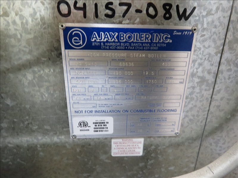 HIGH PRESSURE STEAM BOILER ($1,000 REFUNDABLE DEPOSIT REQUIRED TO ENSURE BUYER PROPERLY & SAFELY DISCONNECTS & REMOVES BOILER OR HIRES SOMEONE TO PROPERLY DO IT)