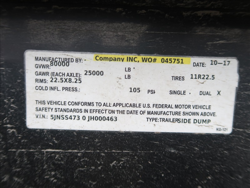 TRI/A, 46' O.A.L. SIDE DUMP TRAILER, 80,000 LB GVWR 36' STEEL BOX, REAR DROP AXLE, A/B, 11R22.5