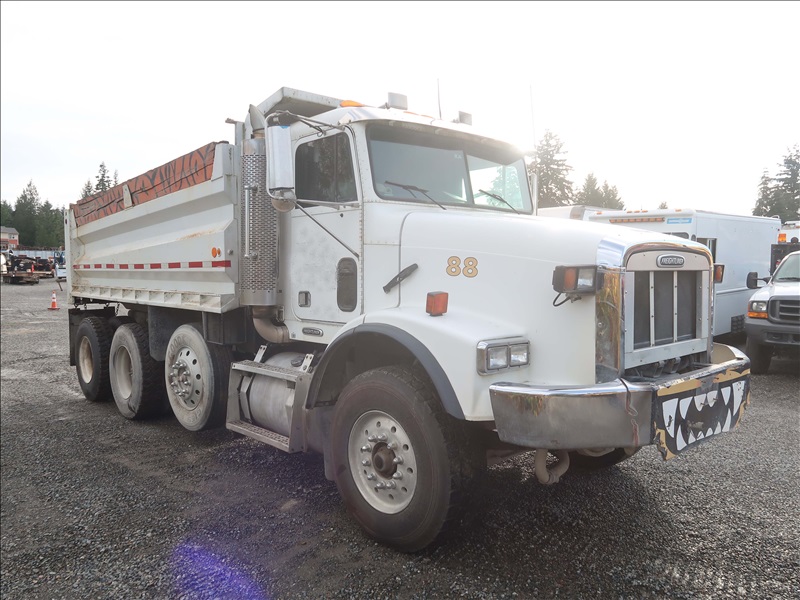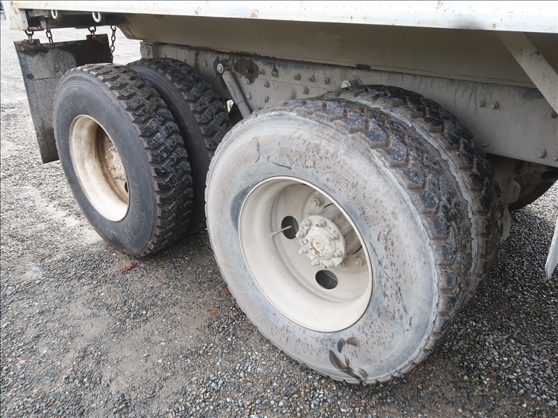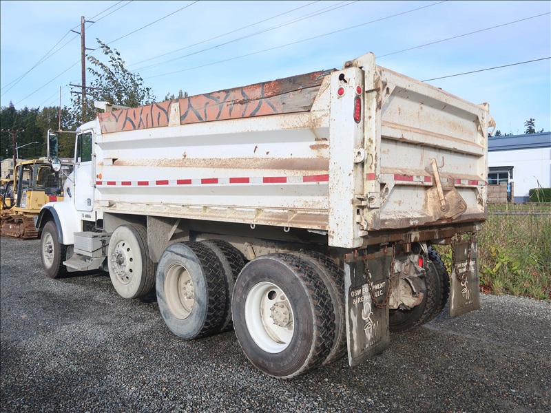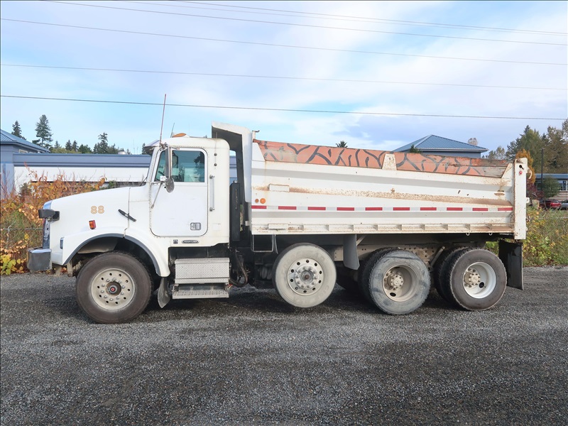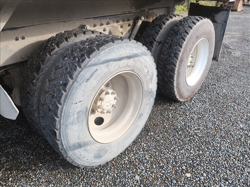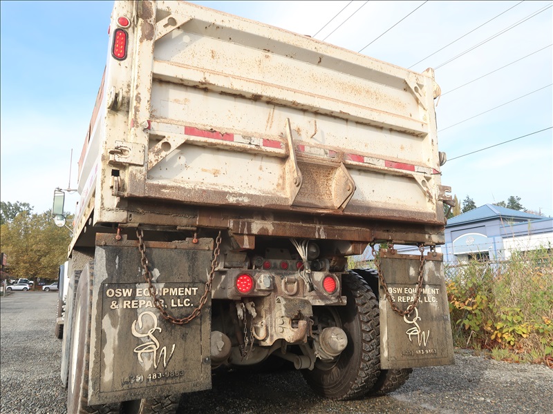 TRI/A DUMP TRUCK, 15' STEEL BOX, ASPHALT GATE, CUMMINS M11-370E, AUTO, CHALMERS SUSPENSION, 195" W/B, 18,000 LB FRONT, 40,000 LB REARS, DROP AXLE, PLUMBED FOR PUP