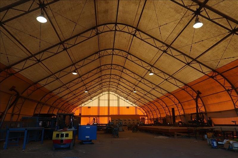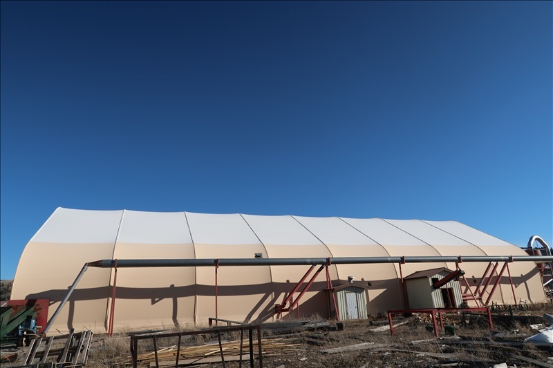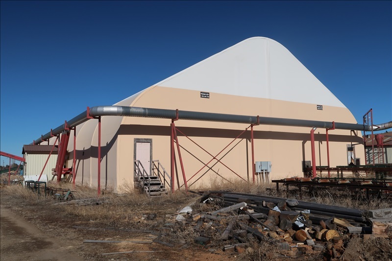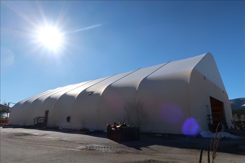 APPROX 40' CENTER HEIGHT X 80' WIDE X 180' LONG PORTABLE BUILDING, METAL FRAMED, CANVAS COVERED, APPROX 30' POWERED GARAGE DOOR, (3) MAN DOORS