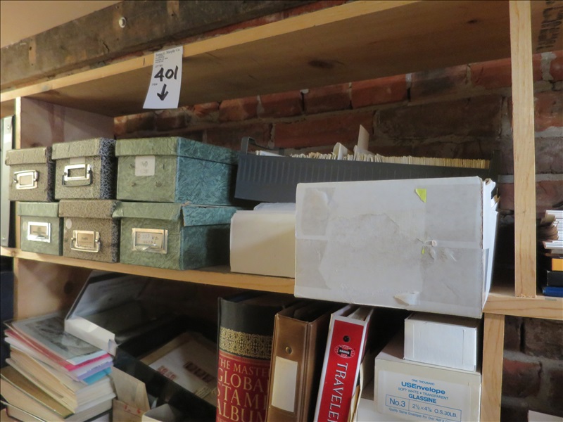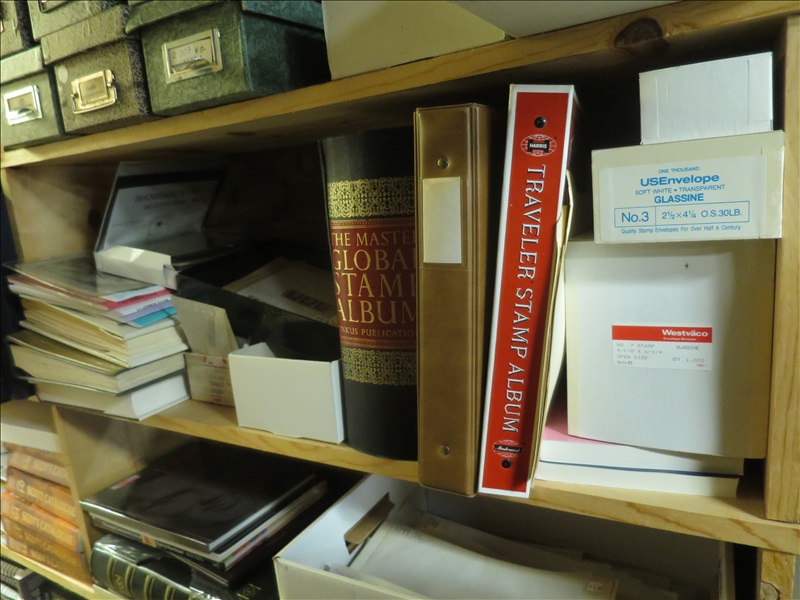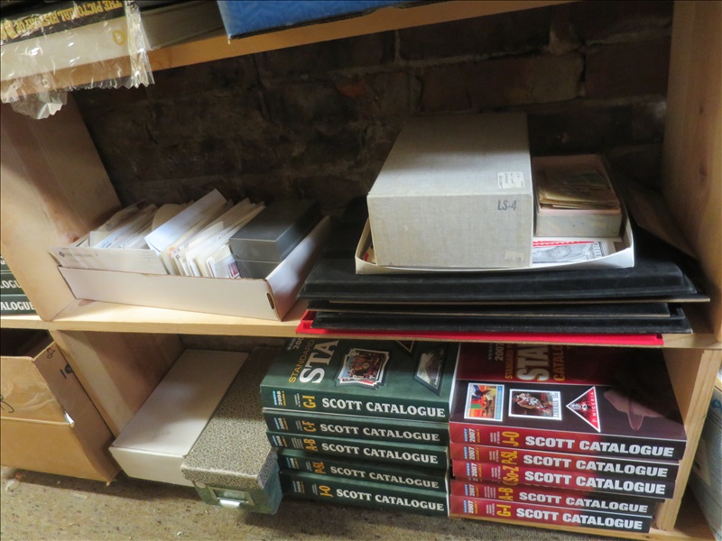 LOT, ASSORTED STAMPS, CATALOGS & SUPPLIES ON THESE (5) SHELVES