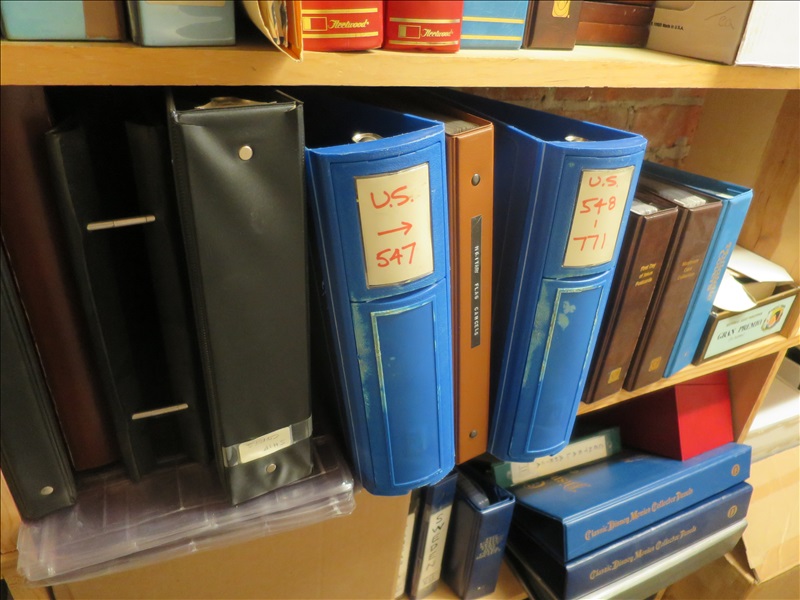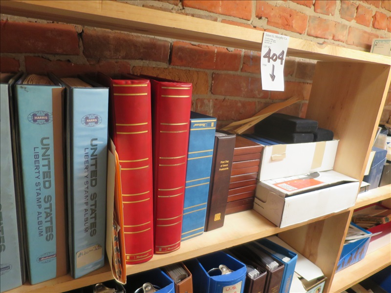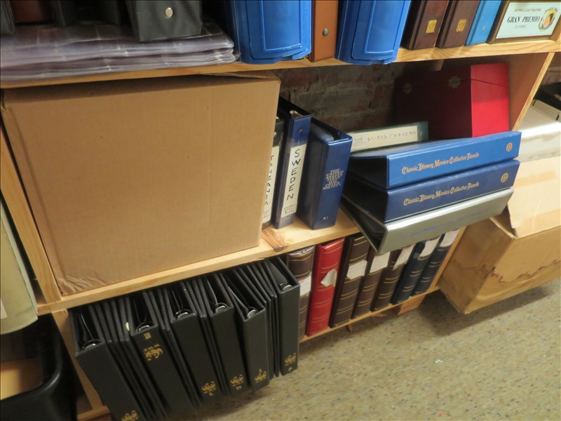 LOT, ASSORTED STAMPS & EMPTY BINDERS ON THESE (4) SHELVES
