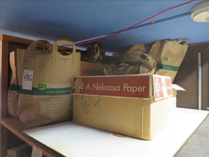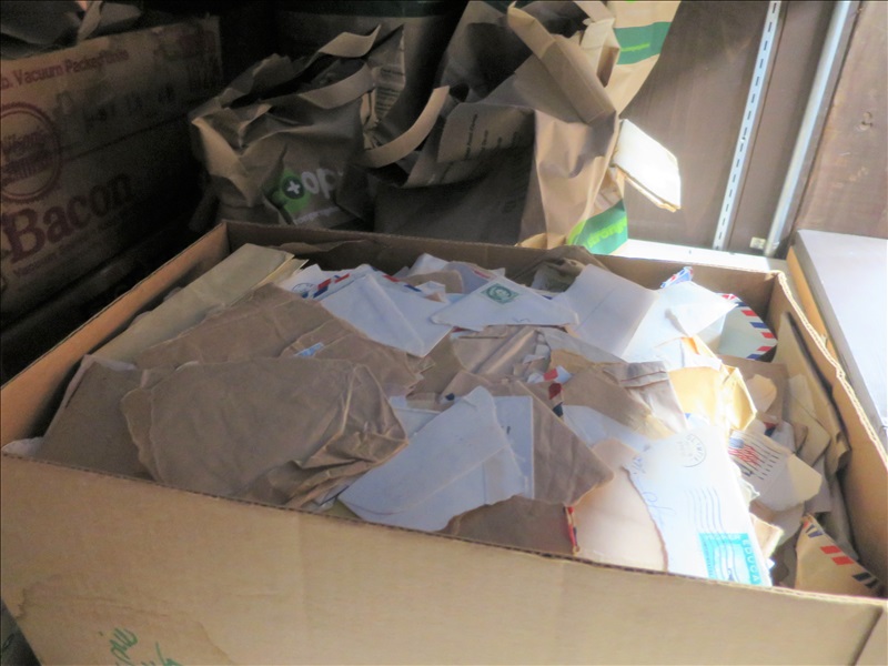 LOT, ASSORTED BULK STAMPS IN PAPER BAGS ON TOP OF THIS CABINET