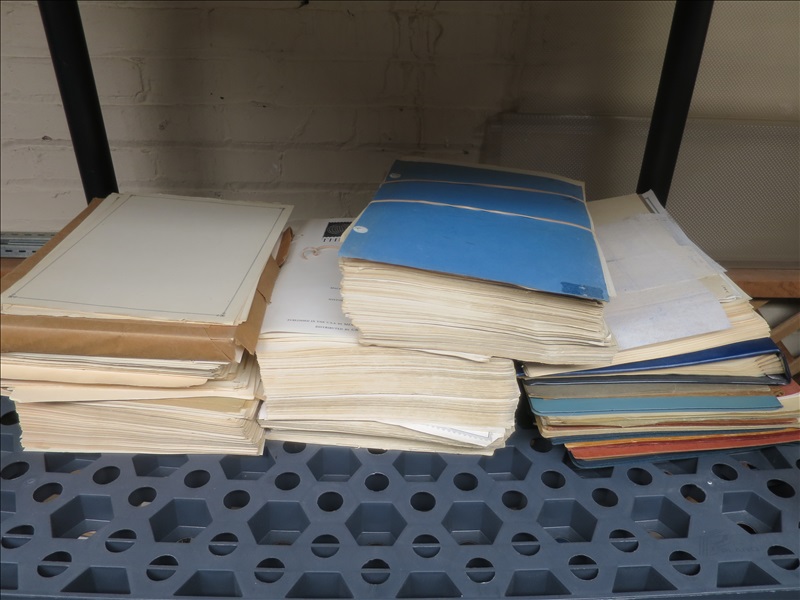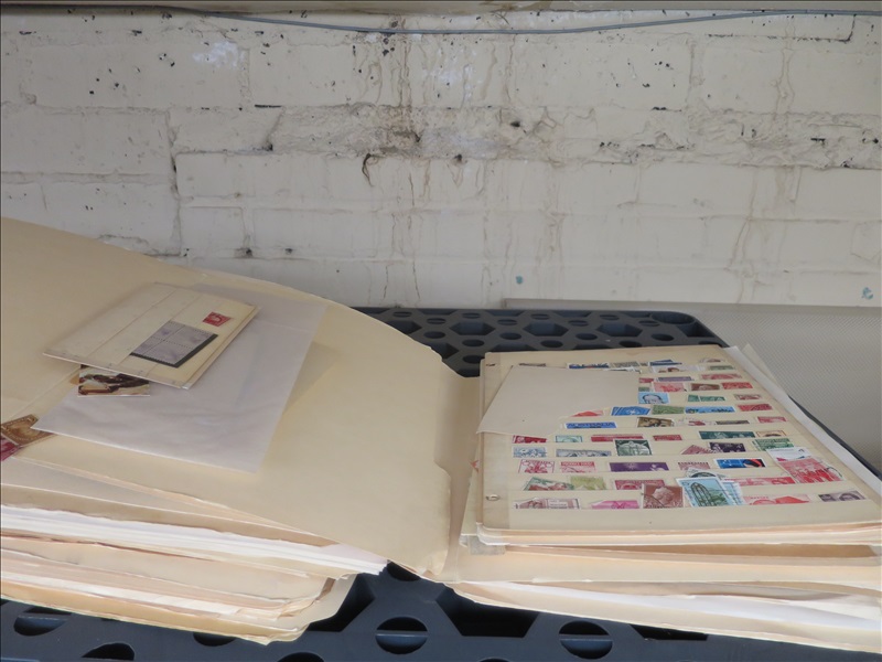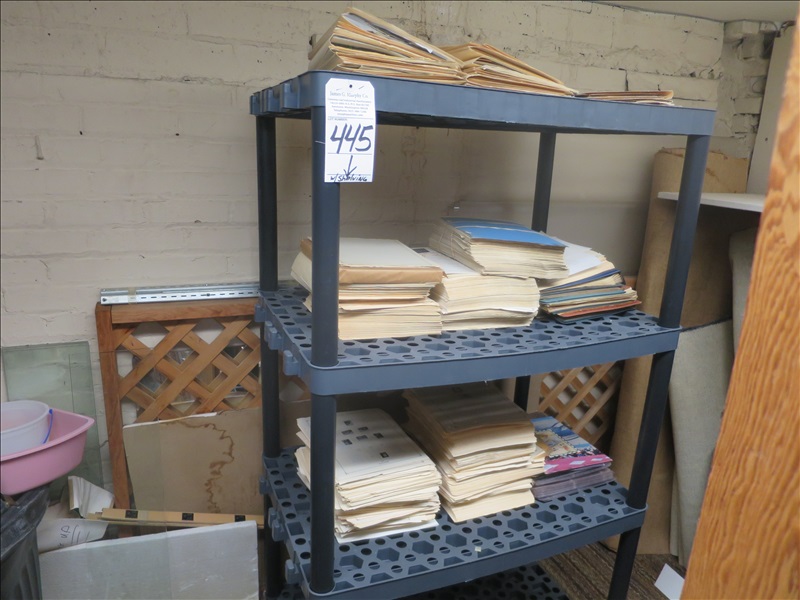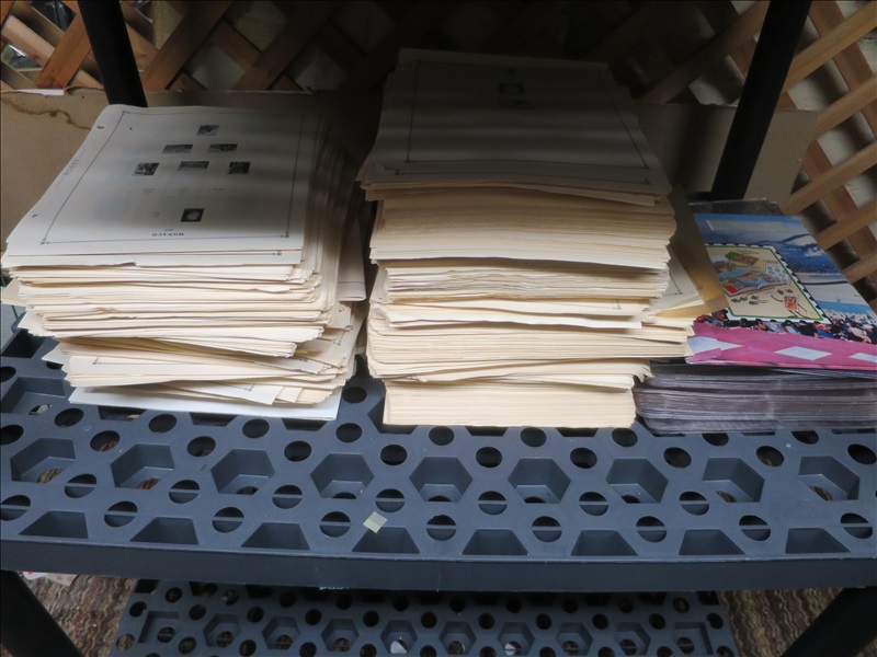 LOT, ASSORTED STAMPS & PAGES W/PLASTIC SHELVING UNIT
