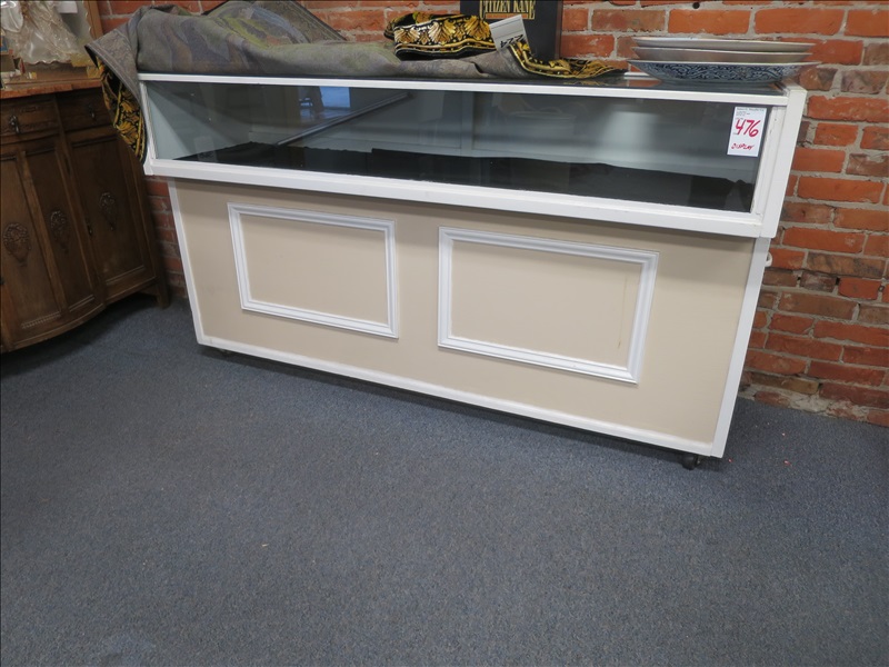 APPROX 73"W WOOD DISPLAY CASE ON CASTERS (REMOVAL IS FRIDAY, MARCH 18TH, 8 AM - 1 PM)
