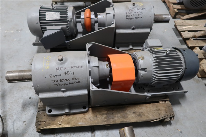 GEAR REDUCER WITH 7 1/2 HO BALDOR TEFC 230/460, 1,750 RPM, DIRECT COUPLED, MOUNTED ON A COMMON SUB-BASE, 45:1 REDUCTION, 38 RPM, 3 1/4" OUTPUT DRIVE SHAFT, NEW OIL SEALS INSTALLED
