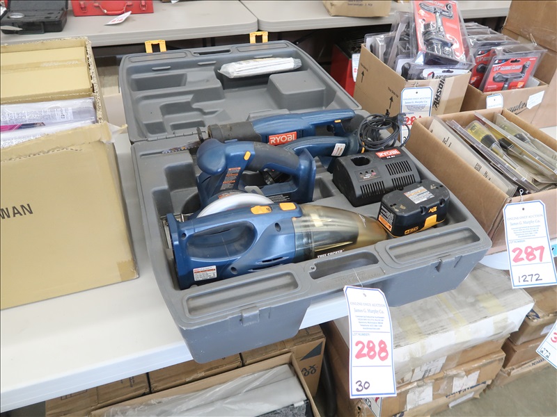 LOT, RYOBI 18V CORDLESS TOOL SET TO INCLUDE: (1) P501 5-1/2" CIRCULAR SAW, (1) RJC181 RECIPROCATING SAW, (1) VC180 VACUUM, (1) FL1800 FLASHLIGHT, (2) BATTERIES & CHARGER