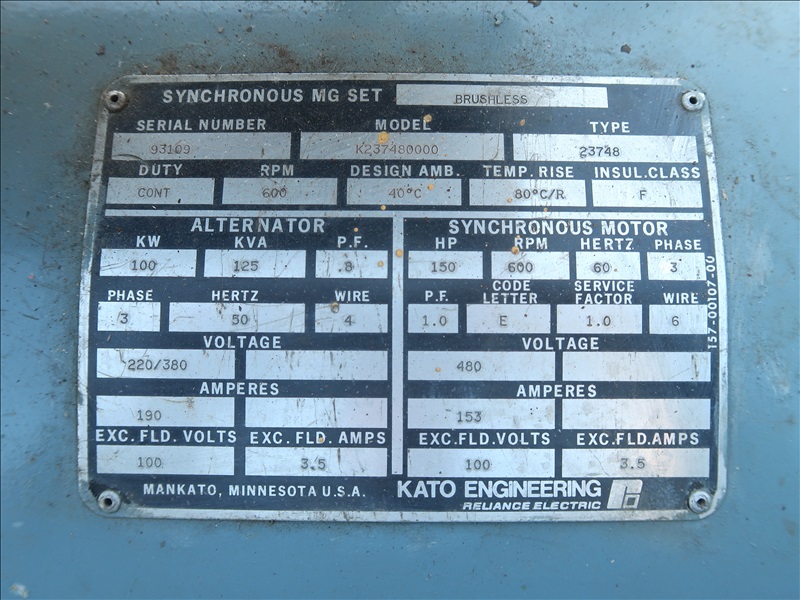 BRUSHLESS SYNCHRONOUS MG SET, 100 KW/100 125 KVA, 220/380V, 3 PHASE ALT, 150 HP, 480V MOTOR & MOTOR GENERATOR CONTROL PANEL