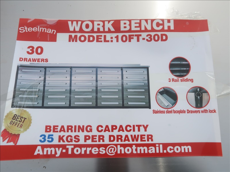 10' 30-DRAWER WORKBENCH, STAINLESS DRAWER (UNUSED)