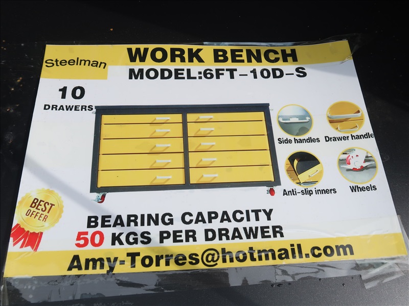 6' 10-DRAWER WORKBENCH, YELLOW DRAWERS (UNUSED)