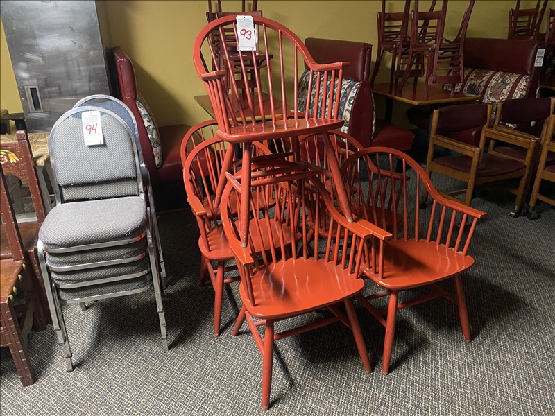 LOT, (7) SPINDLE BACK WOOD DINING CHAIRS (IN BASEMENT)