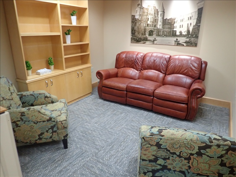 WAITING AREA TO INCLUDE: (2) SIDE CHAIRS, COUCH, WALL MOUNTED TELEVISION, ART & DÉCOR