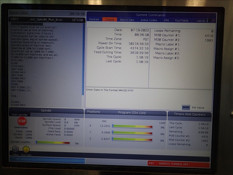 CNC VERTICAL MACHINING CENTER, 24-STATION SIDE MOUNT ATC, 16"X36" TABLE, CHIP AUGER, CONTROLS, 4TH READY, S/N: 1129582