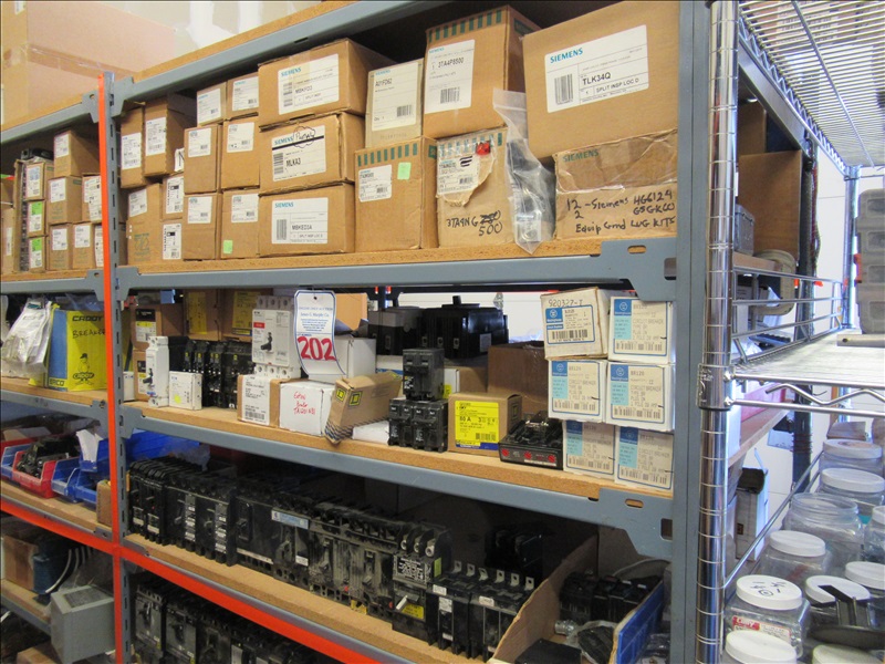 LOT, ASSORTED BREAKERS ON THESE (3) SHELF SECTIONS
