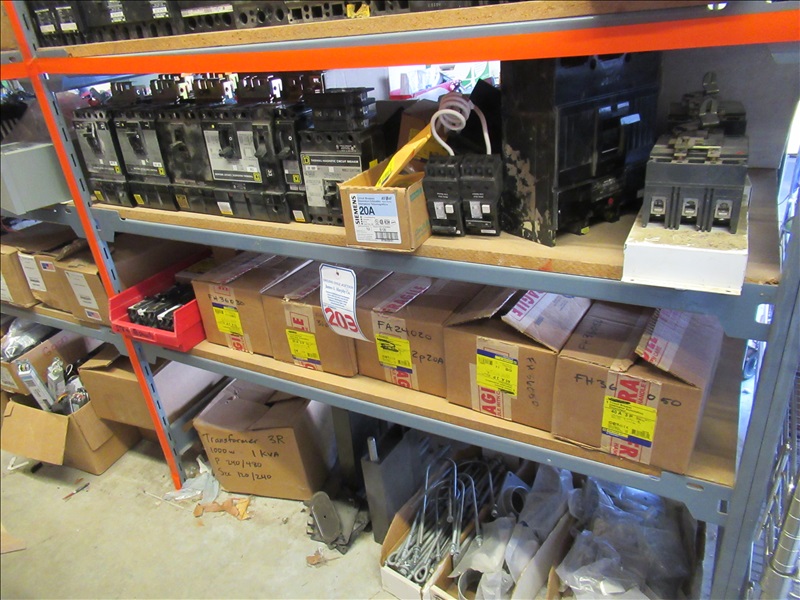 LOT, ASSORTED BREAKERS & HARDWARE ON THESE (3) SHELF SECTIONS