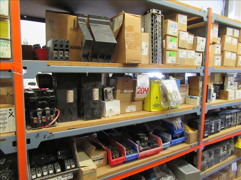 LOT, ASSORTED BREAKERS ON THESE (3) SHELF SECTIONS
