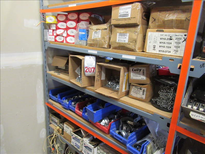 LOT, ASSORTED HARDWARE & CONDUIT HANGERS ON THESE (2) SHELF SECTIONS