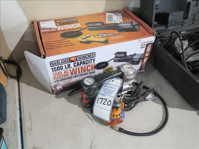 LOT, (1) 1,500 LB ELECTRIC WINCH, 120V, (1) 12V TIRE PUMP & (1) AIR PALM NAILER