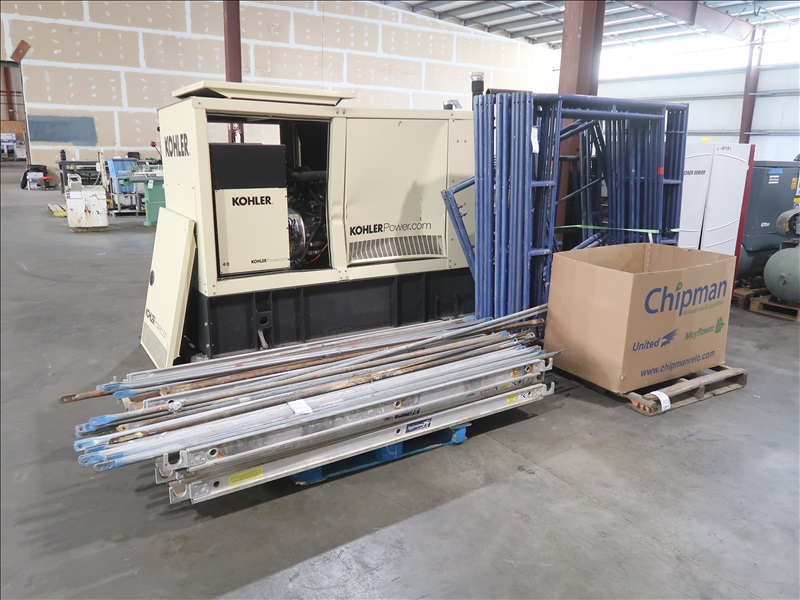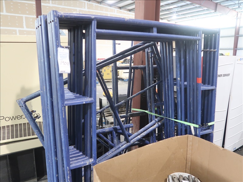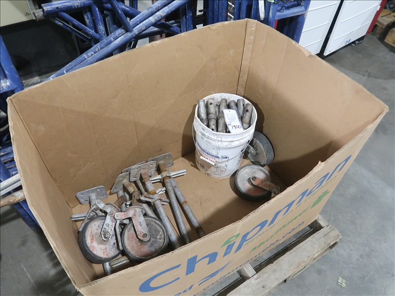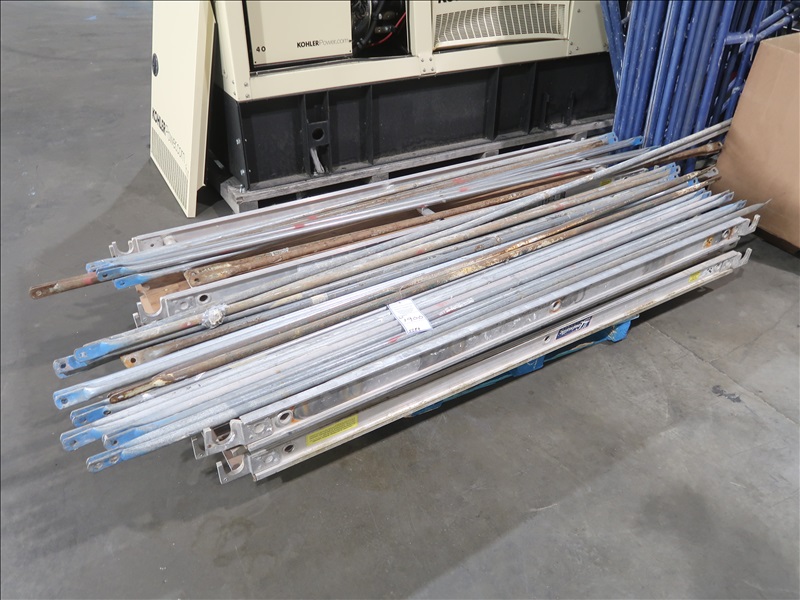 LOT, STEEL SCAFFOLDING UPRIGHTS, CROSS BRACES, WHEELS, COUPLER PINS & ALUMINUM SCAFFOLD DECKS