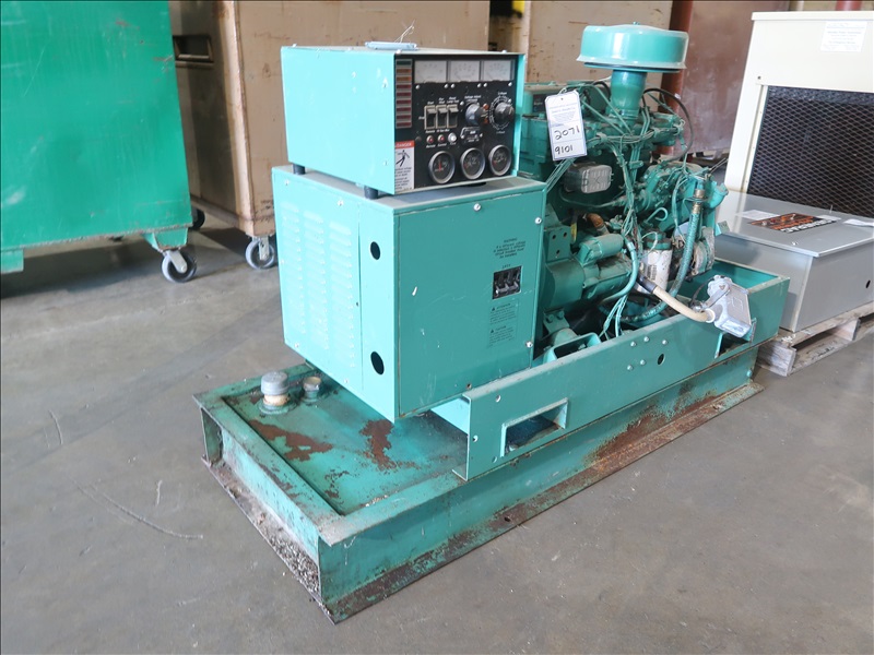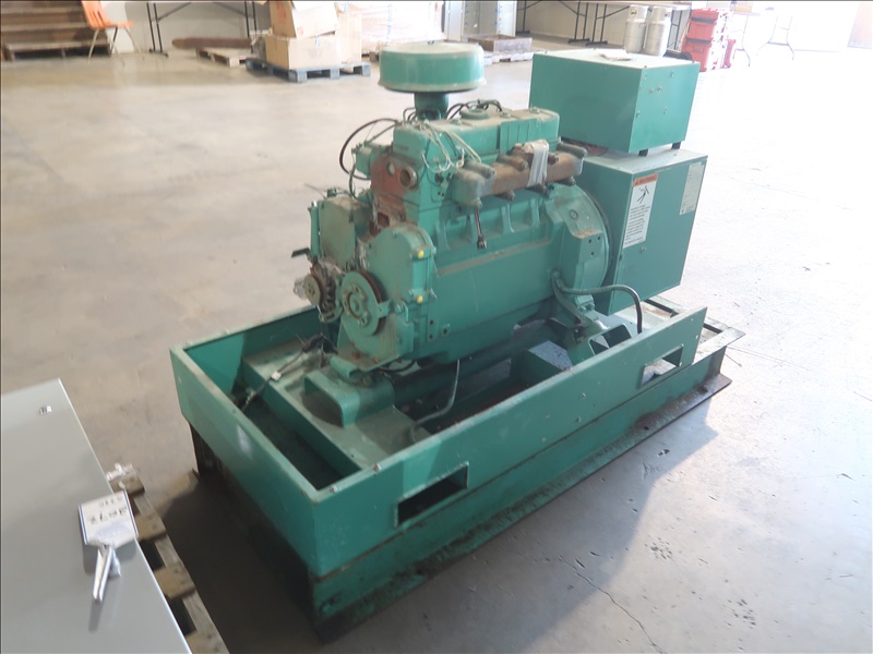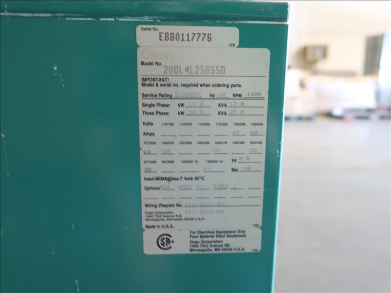 20 KW SKID MOUNTED STANDBY GENERATOR W/4 CYL DIESEL ENGINE W/FORK POCKETS, 240V, 3 PHASE, HOUR METER READS: 179