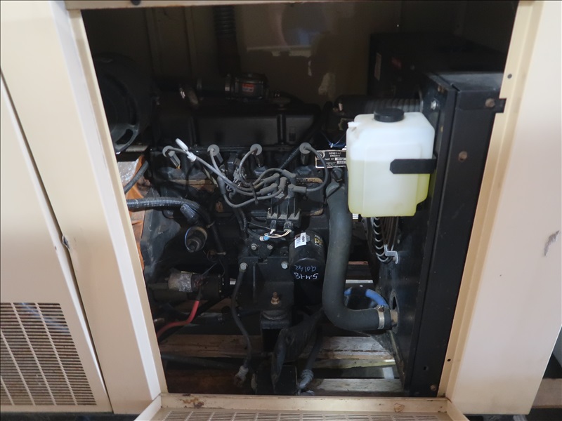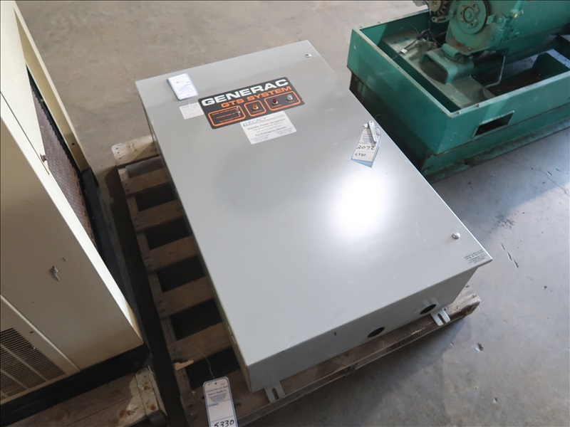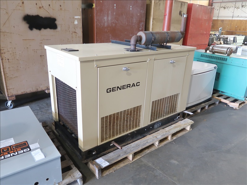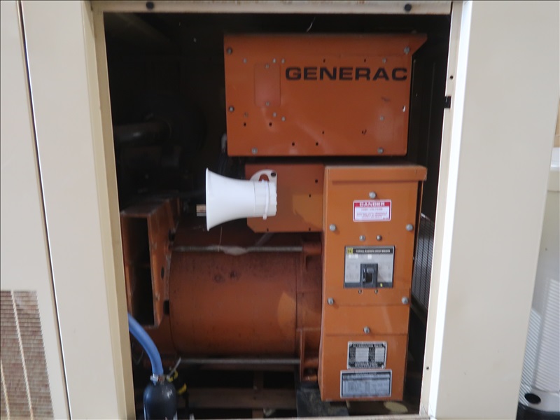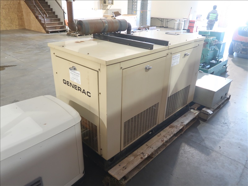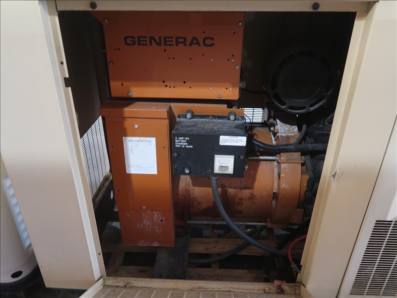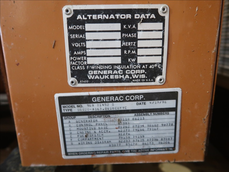 LOT, 20 KW SKID MOUNTED STANDBY 4 CYL LP GAS ENGINE W/GENERAC GTS SYSTEM CONTROL PANEL, 120/240V, SINGLE PHASE, HOUR METER READS: 973