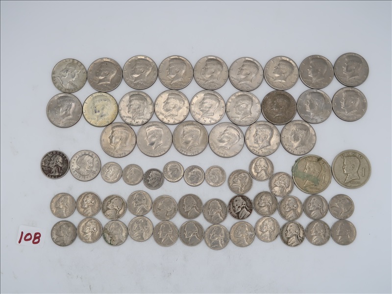 LOT, APPROX (1) SUSAN B ANTHONY DOLLAR, (1) FRANKLIN (23) KENNEDY HALF DOLLARS, (1) 1965-69 QUARTER, (6) 1965-69 DIMES, (27) 1964 & PRIOR NICKELS, & (2) FOREIGN COINS