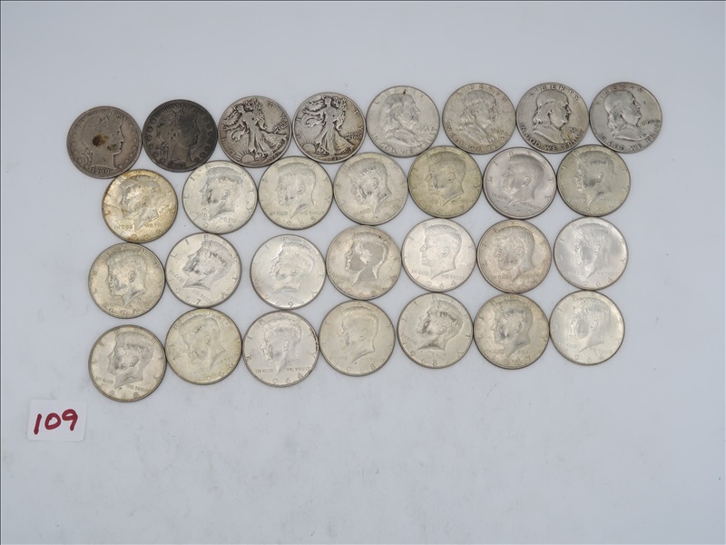 LOT, APPROX (2) BARBER, (2) WALKING LIBERTY, (4) FRANKLIN, & (21) KENNEDY HALF DOLLARS