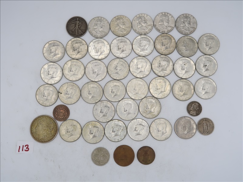 LOT, APPROX (1) MORGAN SILVER DOLLAR, (1) 1940 WALKING LIBERTY, (5) FRANKLIN, & (33) KENNEDY HALF DOLLARS, (1) STANDING LIBERTY QUARTER, (1) 1964 NICKEL, (1) 1868 2 CENT PIECE, 7 (2) FOREIGN COINS