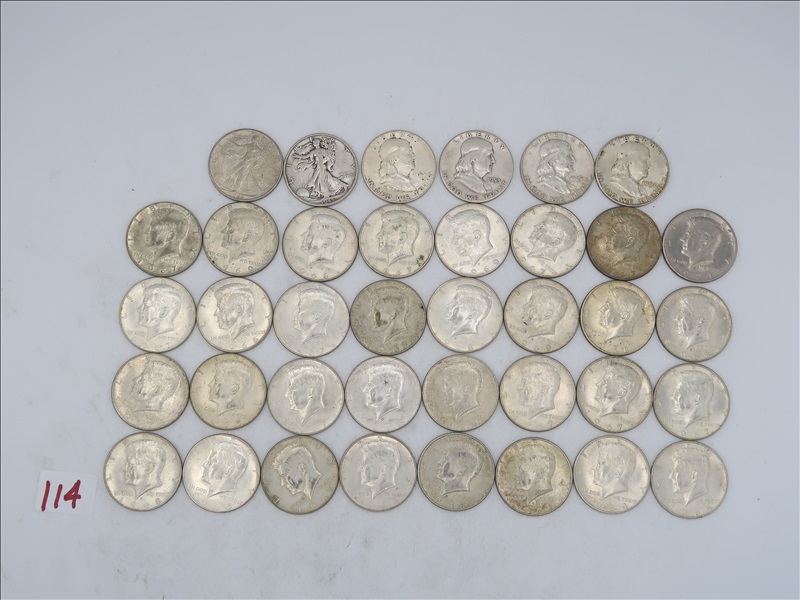 LOT, APPROX (2) WALKING LIBERTY, (4)FRANKLIN, & (32) KENNEDY HALF DOLLARS