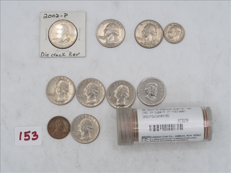 LOT, APPROX (5) 1964 & PRIOR, (1) BICENTENNIAL, (41) UNCIRCULATED STATEHOOD, & (1) 2002P LOUISIANA STATE QUARTERS, (1) 1969 DIME, (1) 1962 PENNY, & (1) FOREIGN COIN