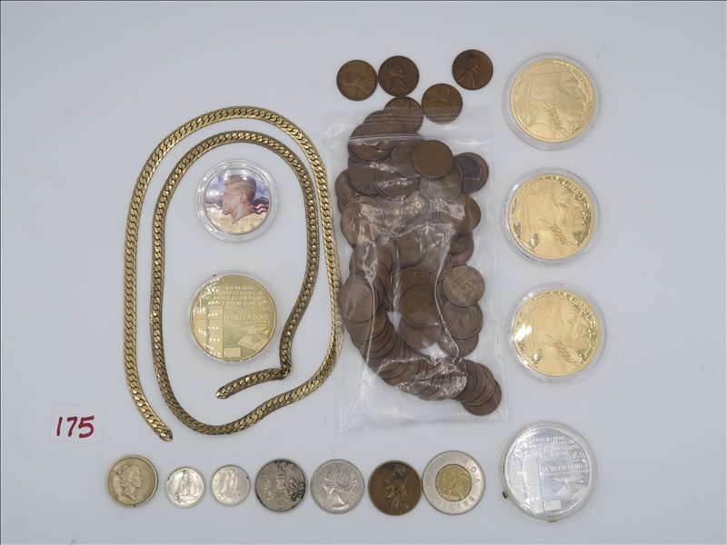 LOT, APPROX (1) COLORED KENNEDY HALF DOLLAR, (77) WHEAT PENNIES, (5) COMMEMORATIVE COINS, (LIBERTY INDIAN HEAD COINS ARE COPIES), (7) FOREIGN COINS, (1) YELLOW METAL NECKLACE