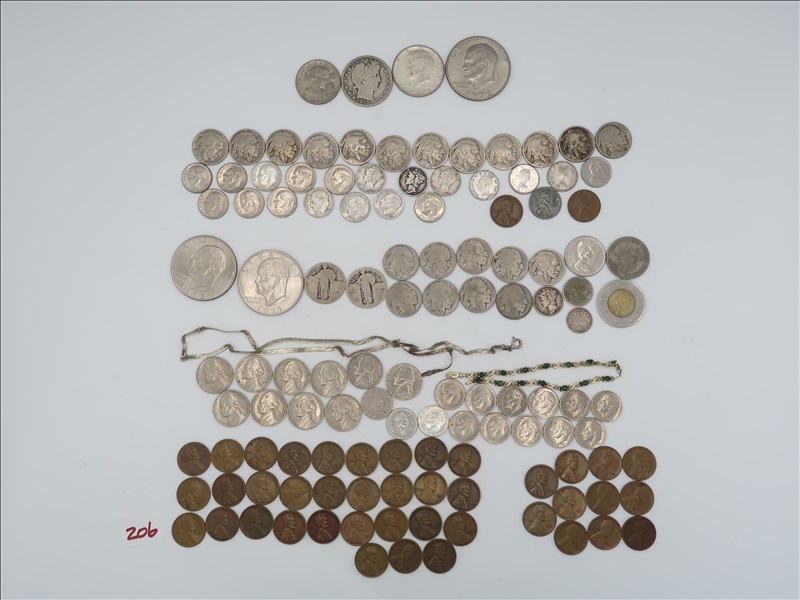 LOT, APPROX (3) IKE, & (1) SUSAN B ANTHONY DOLLARS, (1) 1915 BARBER, & (1) KENNEDY HALF DOLLARS, (2) LIBERTY STANDING QUARTERS, (4) MERCURY, (5) 1964 & PRIOR, & (19) 1965-69 DIMES, (9) BUFFALO, & (10) 1964 & PRIOR NICKELS, (1) 1874 NICKEL THREE CENT PIECE