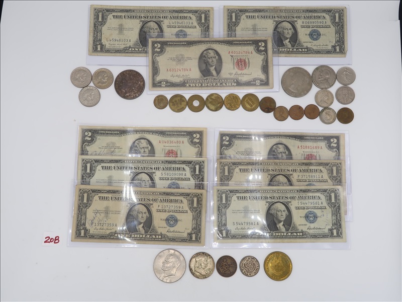 LOT, (1) 1890 MORGAN SILVER DOLLAR, (1) IKE, & (3) SUSAN B ANTHONY DOLLARS, (14) FOREIGN COINS, (6) TOKENS, (4) $1 SILVER CERTIFICATES, & (3) $2 US NOTES W/RED SEALS