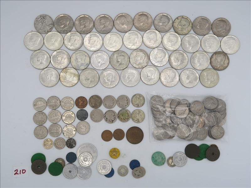 LOT, APPROX (1) 1942 LIBERTY, (11) 1964 & PRIOR KENNEDY, (19) 1965-69 KENNEDY, & (9) KENNEDY HALF DOLLARS, (5) BUFFALO, (1) V, & (54) 1964 & PRIOR NICKELS, (1) PENNY, (16) FOREIGN COINS, (25) TOKENS, & ASSORTED COLLECTABLES