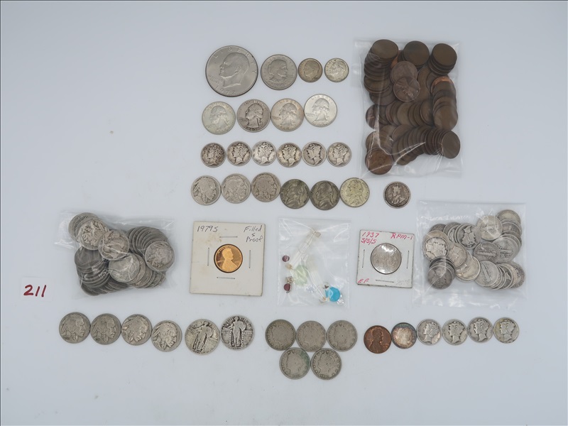 LOT, APPROX (1) IKE, & (1) SUSAN B ANTHONY DOLLARS, (2) LIBERTY STANDING, & (4) 1964 & PRIOR QUARTERS, (47) MERCURY, & (1964 & PRIOR DIMES, (49) BUFFALO, (5) V, & (3) WAR NICKELS, (72) WHEAT, & (1) 1979 S PROOF PENNIES, (1) FOREIGN COIN, & ASSORTED COLLEC