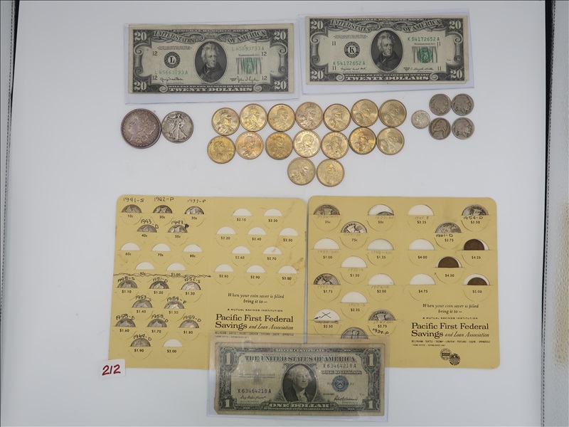 LOT, APPROX (1) 1885 MORGAN SILVER DOLLAR, (16) SACAGAWEA DOLLARS, (1) LIBERTY WALKING HALF DOLLAR, (1) LIBERTY STANDING, & (7) 1964 & PRIOR QUARTERS, (6) MERCURY, & (9) ROOSEVELT DIMES, (3) BUFFALO, (1) 1941 NICKELS, (3) PENNIES, (1) $1 1957 SILVER CERTI