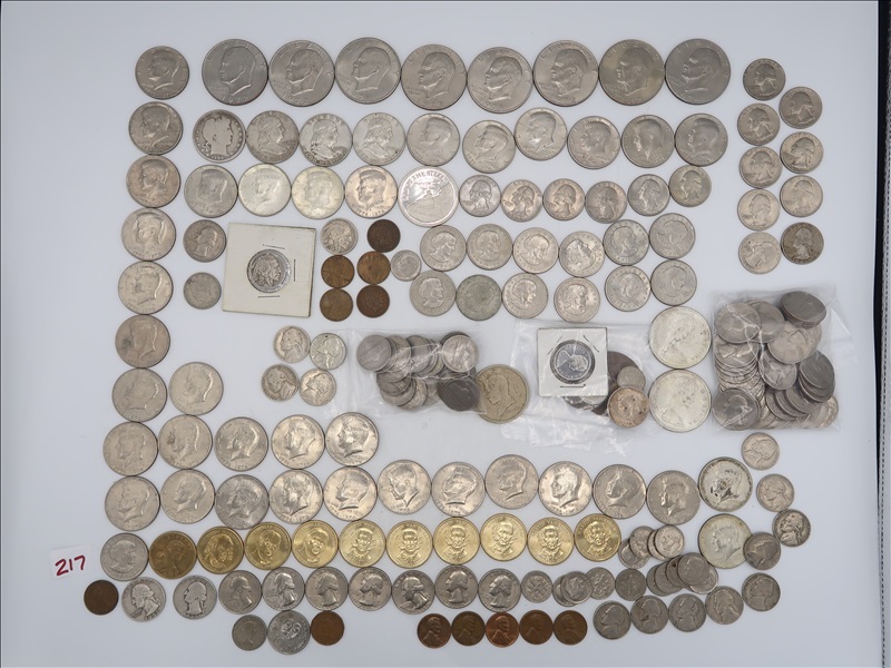 LOT, APPROX (8) IKE, (13) SUSAN B ANTHONY, (1) SACAGAWEA, & (9) PRESIDENTIAL DOLLARS, (1) 1906 BARBER, (3) FRANKLIN, (36) & KENNEDY HALF DOLLARS, (6) 1964 & PRIOR, (58) 1965-69, & (10) BICENTENNIAL QUARTERS, (16) 1965-69 DIMES, (2) BUFFALO, (1) V, & (34)