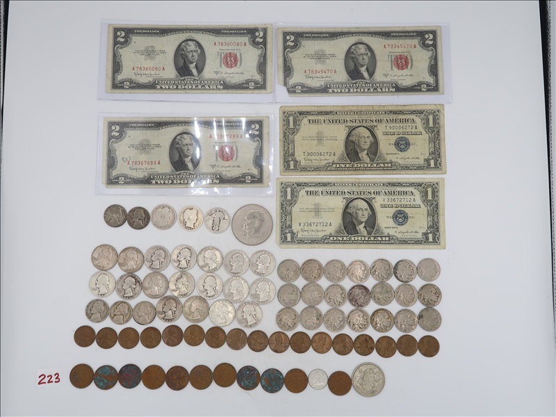 LOT, APPROX (1) IKE DOLLAR, (2) BARBER, (1) LIBERTY STANDING, & (18) 1964 & PRIOR QUARTERS, (21) BUFFALO, (2) WAR, & (3) 1964 & PRIOR NICKELS, (13) FOREIGN COINS, (17) LINCOLN PENNIES, (3) $2 US NOTES W/ RED SEALS, & (2) $1 SILVER CERTIFICATES