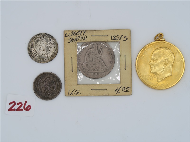 LOT, (1) 1867S LIBERTY SEATED HALF DOLLAR, (1) 1875 LIBERTY SEATED 20 CENT COIN, (1) 1915 BARBER QUARTER, (1) COIN PENDANT