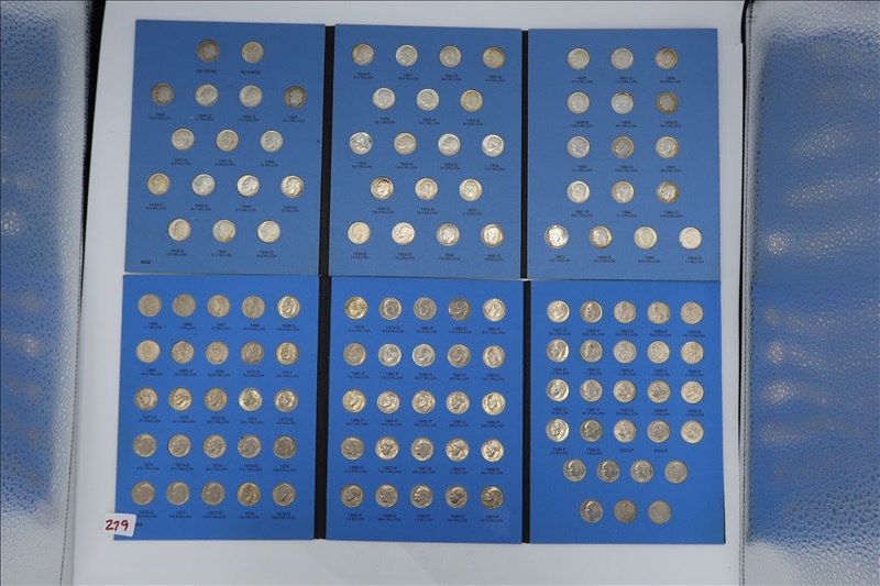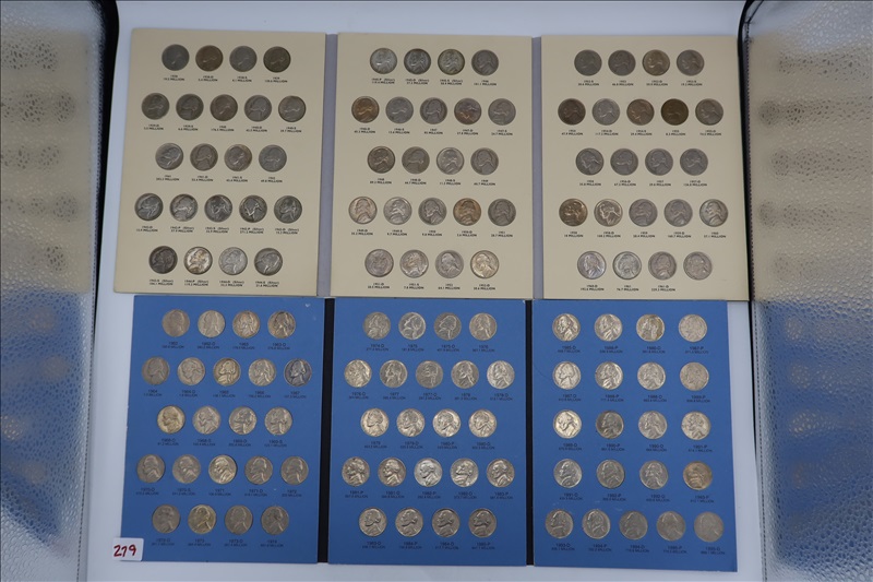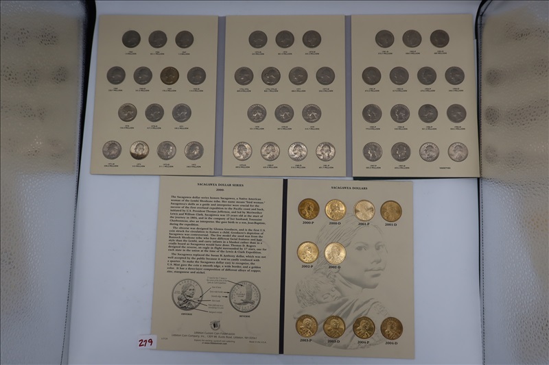 LOT, (1) SACAGAWEA DOLLAR BOOK WITH 10 COINS, (1) WASHINGTON QUARTERS 1965-1987 BOOK WITH 43 COINS, (1) ROOSEVELT DIMES 1946-1964 BOOK WITH 50 COINS, (1) ROOSEVELT DIMES 1965-2005 BOOK WITH 77 COINS, (1) JEFFERSON NICKELS 1938-1961 BOOK WITH 66 COINS, & (