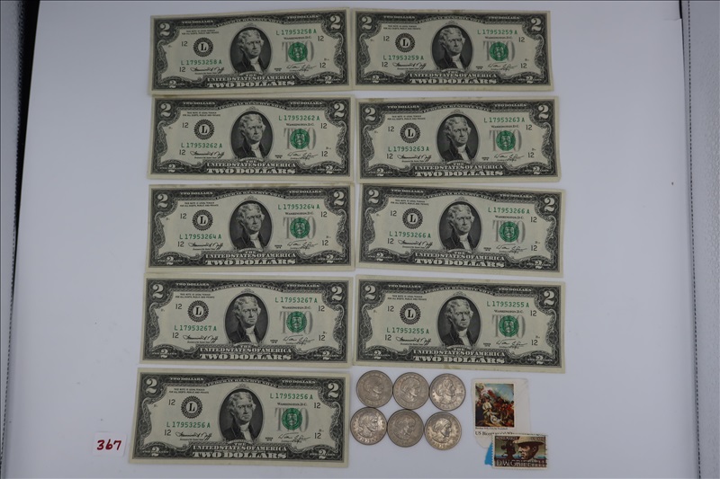 LOT, (9) $2 US NOTES, (6) SUSAN B ANTHONY DOLLARS & (2) US STAMPS
