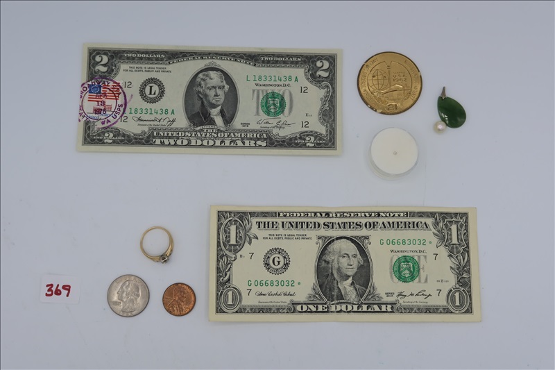 LOT, (1) $2 US NOTE W/STAMP, (1) $1 US NOTE (STAR NOTE), (1) 1965 QUARTER, (1) 1963 PENNY, (1) YELLOW METAL RING WITH A CLEAR STONE (TESTS POSITIVE FOR DIAMOND) & ASSORTED COLLECTABLES