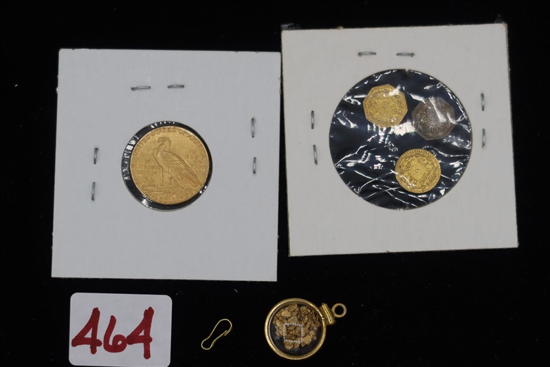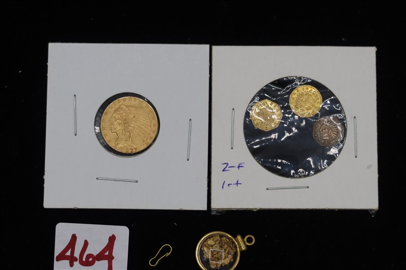 LOT, (1) 1927 $2 1/2 INDIAN HEAD GOLD COIN, (1) SET OF 3 MINI GOLD COINS (COPIES), (1) GOLD FLAKE FILLED PENDANT & ONE YELLOW METAL JEWELRY PIECE