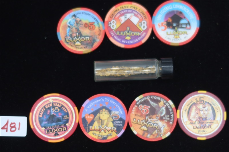 LOT, 2.8 GRAMS YELLOW METAL FLAKESIN A VIAL, & 7 CASINO TOKENS