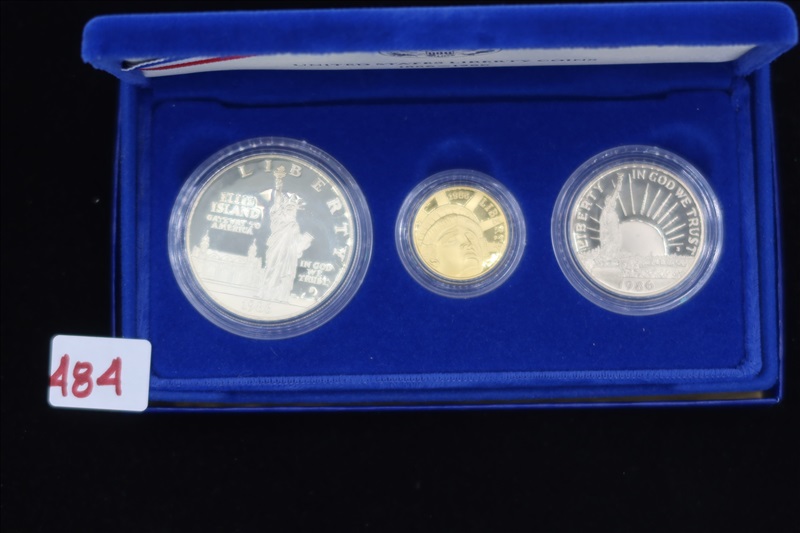 LOT, (1) US SET OF 3 LIBERTY COINS..1986 $5 GOLD, 1986 SILVER $1, 1986 HALF DOLLAR