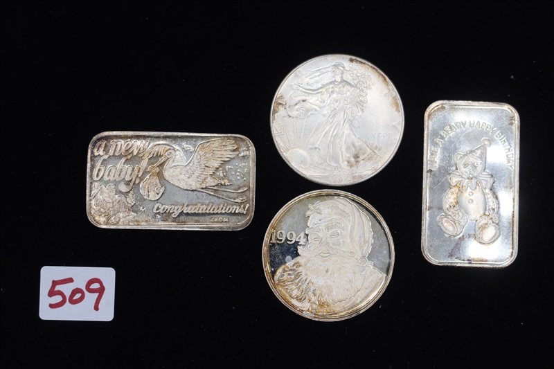 LOT, (1) SILVER EAGLE SILVER DOLLAR & (1) ROUND & (2) BARS SILVER APPROX (4) OZ SILVER