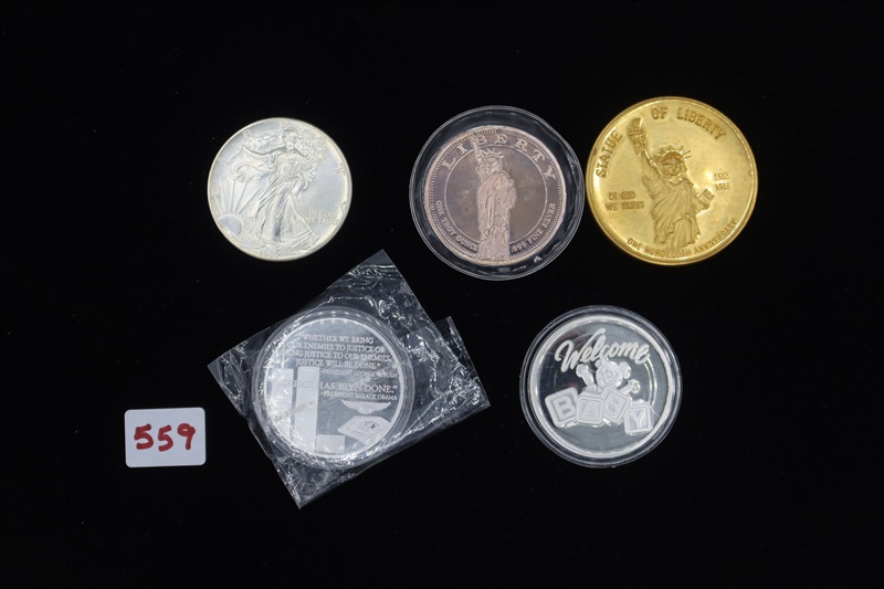 LOT, (1) SILVER EAGLE, (2) SILVER ROUNDS 3 OZ SILVER, 7 (2) MEDALLIONS